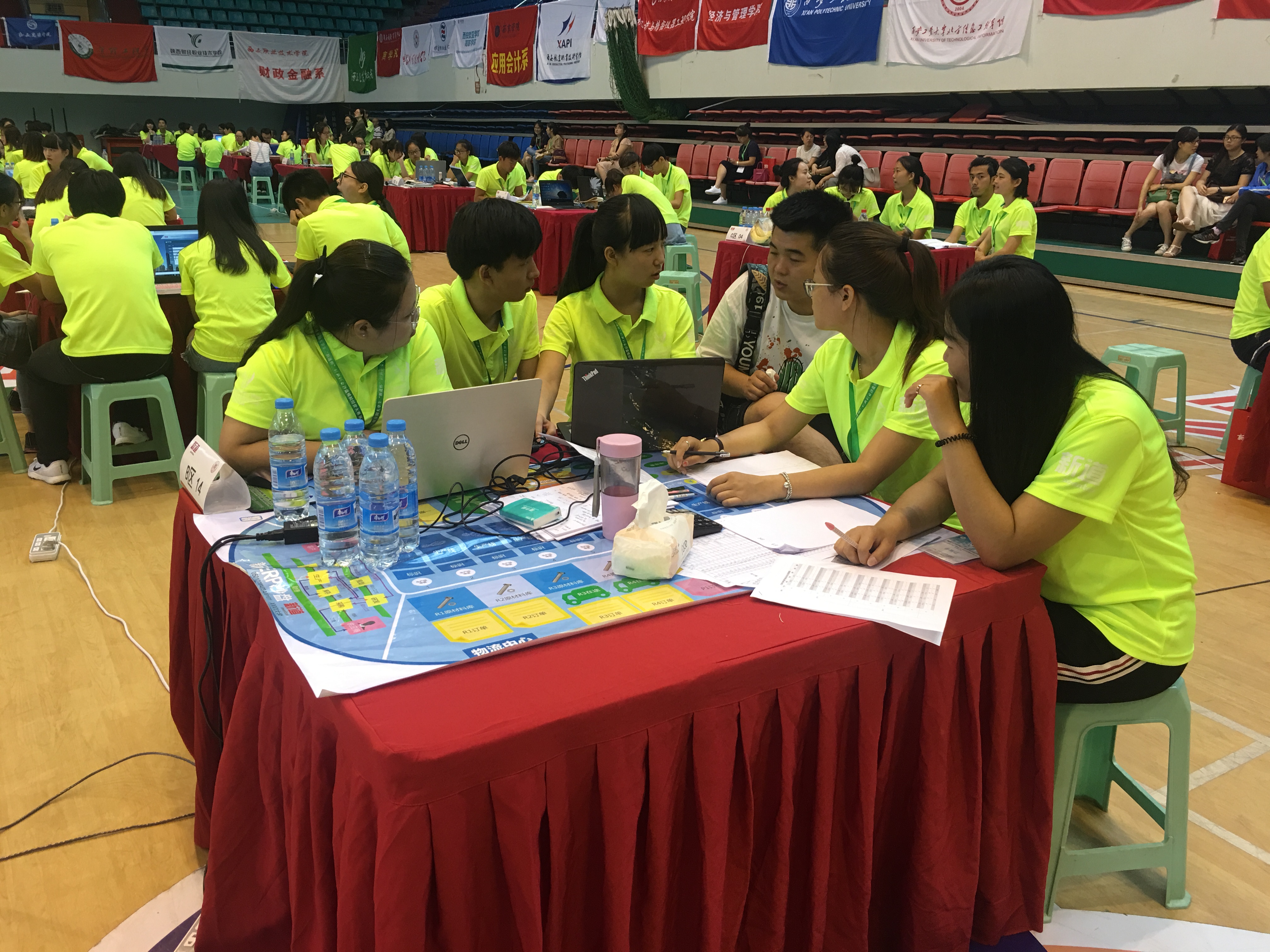 会计学院罗艳妮、杨徐馨二位老师带领会计1504班李冠举、姬云龙、财管1404班韩茹月、财管1502班李玉凤、杨雪五位同学组成的会计学院1队,与会计1402班赵玉叶、会计1405班姚莎、会计1503班陈维维、徐冬浩、审计1501班许晨希五位同学组成的会计学院2队,参与了本次沙盘大赛。
