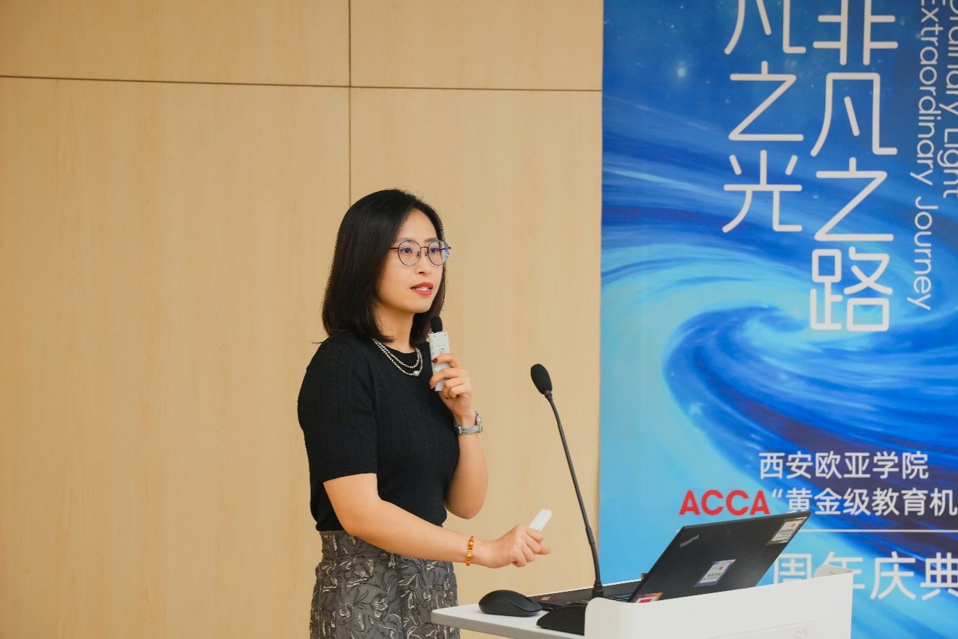 值西安欧亚学院建校三十周年校庆之际,2025年10月18日14:30,以“平凡之光,非凡之路”为主题的ACCA“黄金级教育机构”五周年庆典在北区教学楼A座120隆重举行。这不仅是ACCA项目发展史上的里程碑时刻,更是欧亚向三十校庆献上的一份厚重教育答卷。陕西工商管理硕士学院副院长、西安交通大学管理学院田高良教授,ACCA教育关系发展经理刘芳老师,青岛城市学院会计与金融学院李雪院长,西安工业大学经济管理学院会计学专业负责人史璇教授等15位高校、企业嘉宾莅临见证,与会计金融学院ACCA项目师生代表130余人齐聚一堂,共庆荣耀、共话未来。