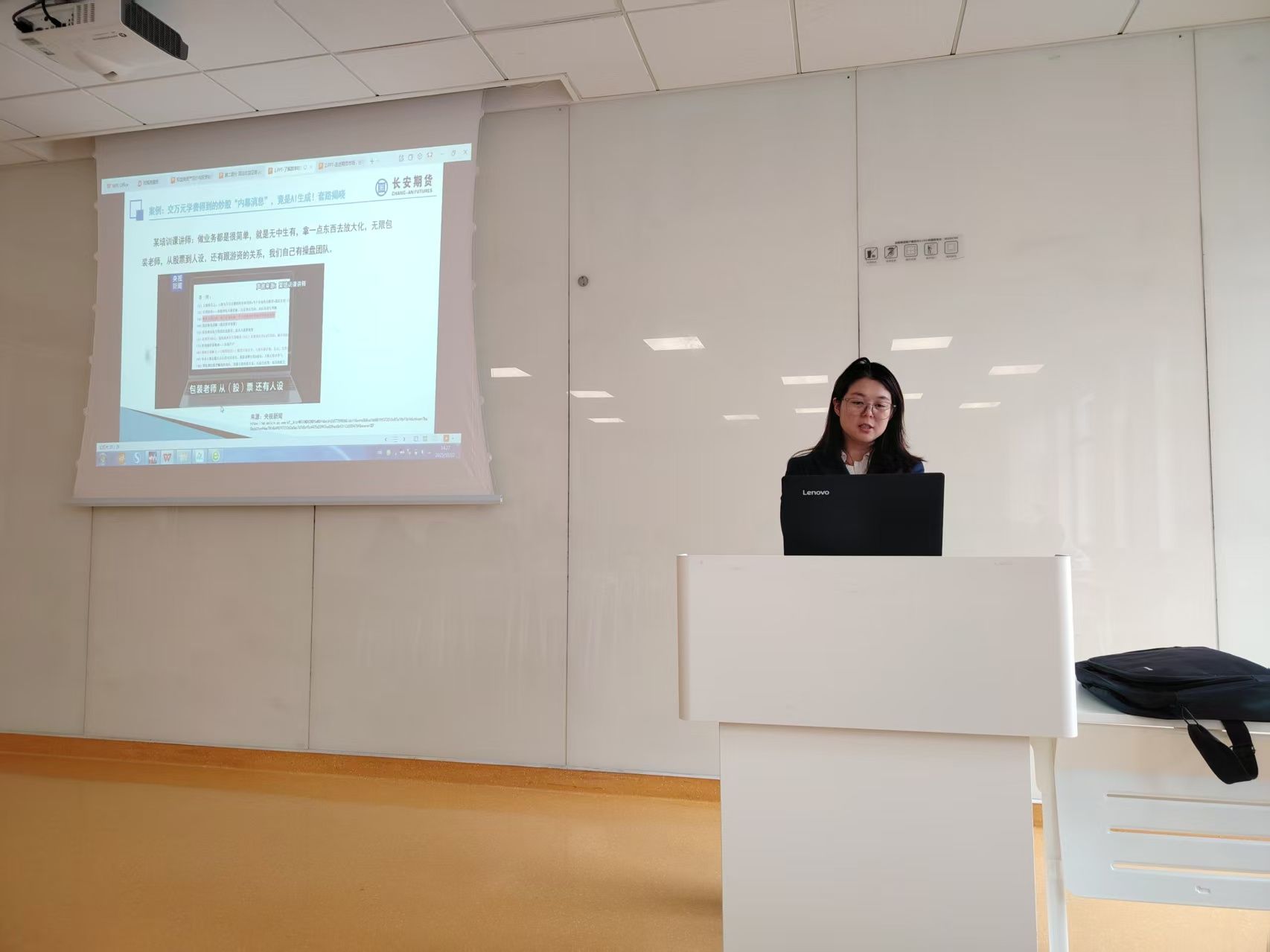 活动于下午14:00准时开始,首先播放了主题宣传片,随后进入专题讲座环节。长安期货合规风控部高级主管苟亚茹以“了解数字时代新骗局,防范非法证券期货等欺诈活动”为题,结合真实案例,深入浅出地剖析了当前常见的非法金融诈骗手段,包括虚假投资平台、高额返利陷阱、非法集资等。还剖析了当前数字化背景下常见的非法金融活动特征与识别要点,讲解了如何识别和防范金融诈骗的关键,帮助师生筑牢金融安全思想防线,增强风险识别和抵御能力。