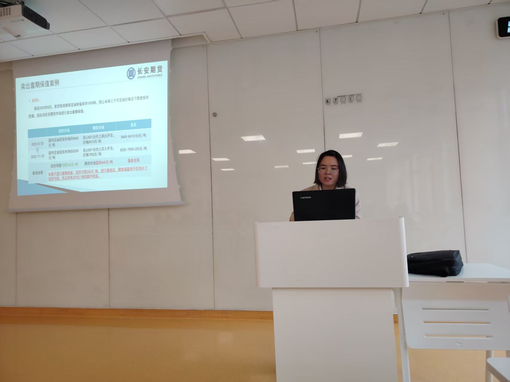 在第二环节中,长安期货研究员屈亚娟以“走进期货市场,分享期货基础知识”为主题,用通俗易懂的语言讲解了期货市场的基本概念、交易规则与风险特征,使师生对期货市场形成了初步认知。同时,通过实际案例强调了理性投资和敬畏市场的重要性,引导全体师生正确认识期货市场,树立理性投资、价值投资的理念。