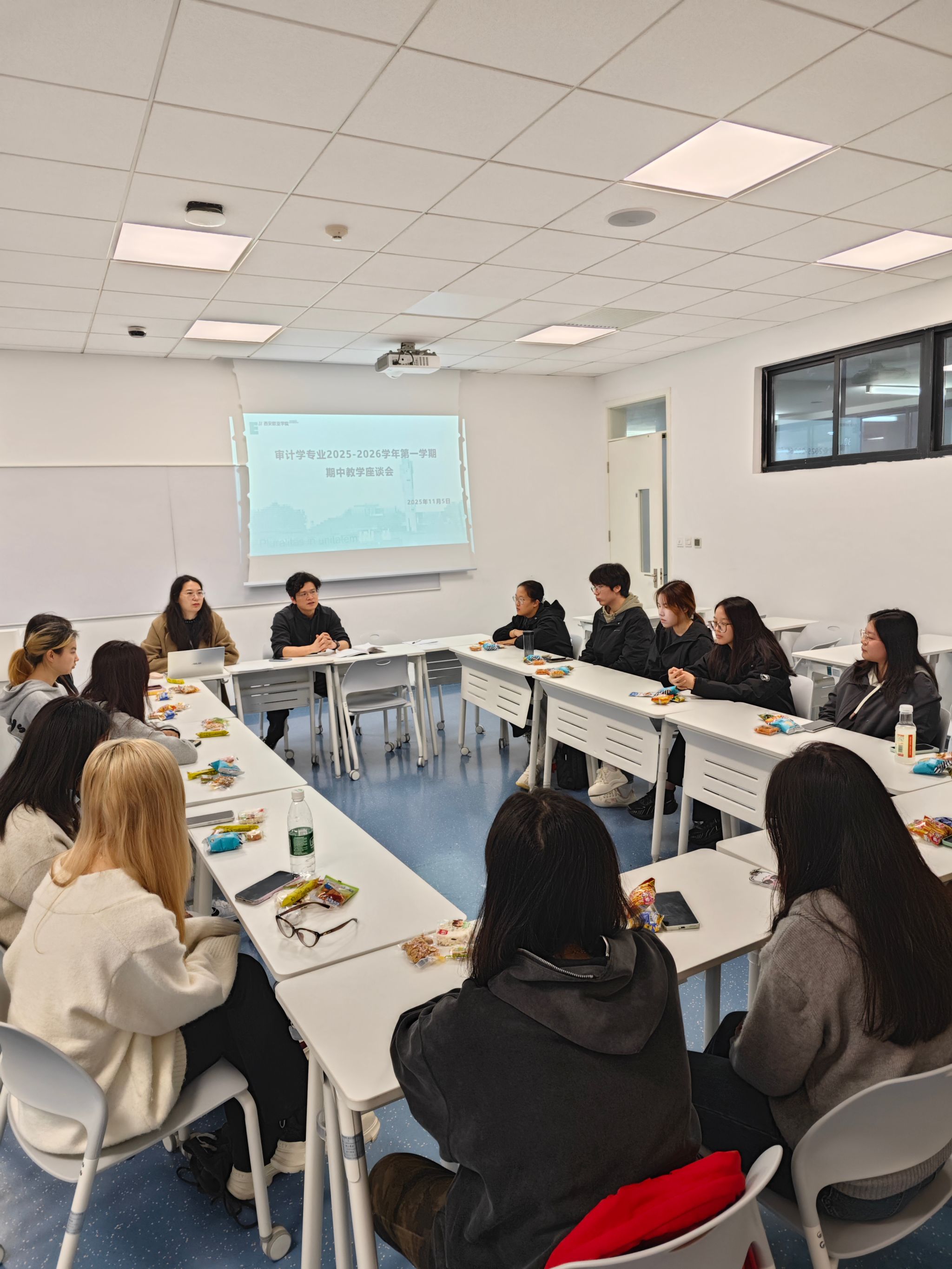 2025年11月5日,西安欧亚学院会计金融学院审计学专业成功举办了本学期期中座谈会。本次座谈会以“深化教学改革,提升育人质量”为主题,旨在搭建高质量的师生互动平台,围绕教学运行、课程衔接、实践教学及学业发展等关键议题进行深入交流,共同推动审计学专业人才培养质量的提升。审计课程中心罗少康、李乐姣、尹继阳老师及审计学专业2023-2025级学生代表参加了本次会议。