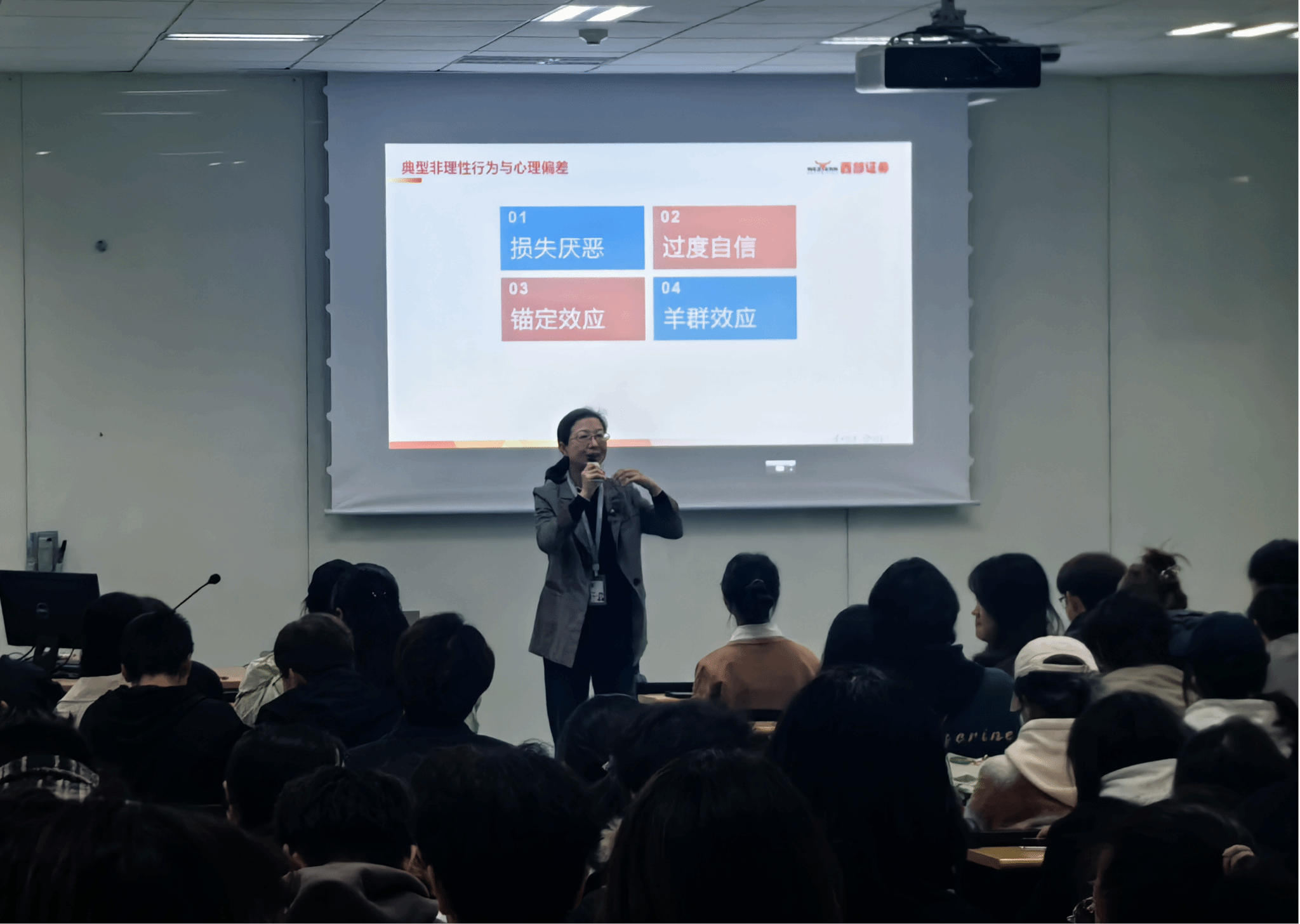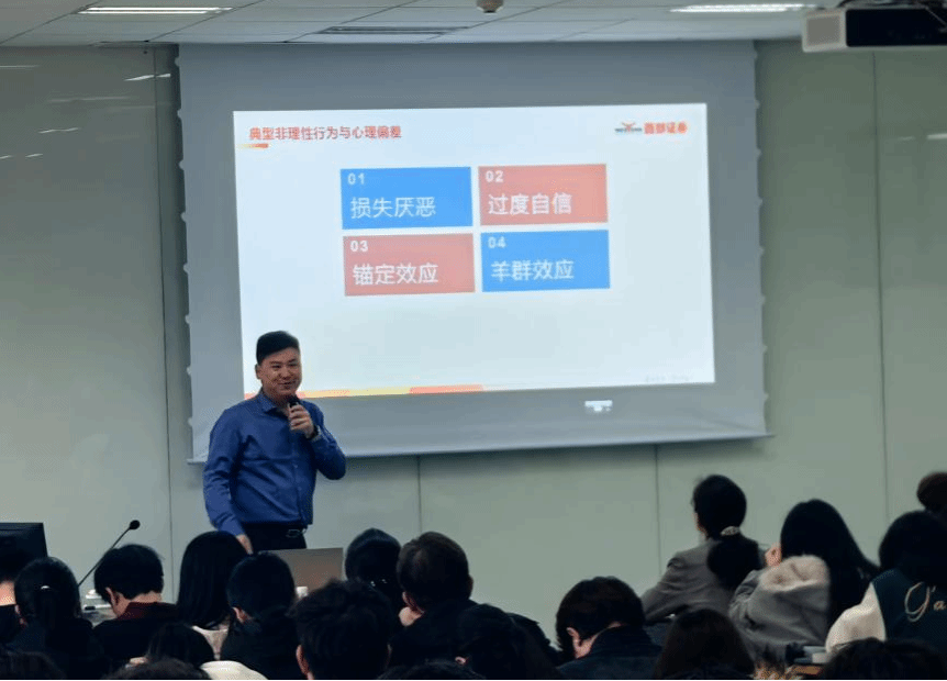 “过度自信”则容易让投资者高估自身能力,忽视市场风险,进而出现频繁交易、集中持仓等问题。数据显示,美国个人投资者年换手率平均达200%,但多数跑输指数,这一案例让新生直观感受到理性决策的重要性。此外,“锚定效应”下投资者过度依赖初始信息(如买入价、历史高点)拒绝止损或盲目追高,“羊群效应”中盲目跟风导致市场泡沫或恐慌,这些生动的解析让新生们意识到,投资不仅是对市场的判断,更是对自身心理的驾驭。