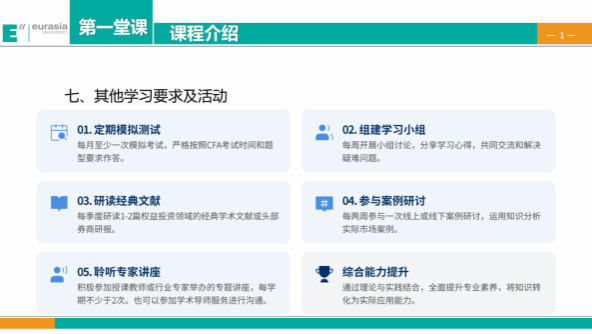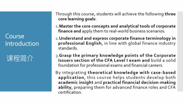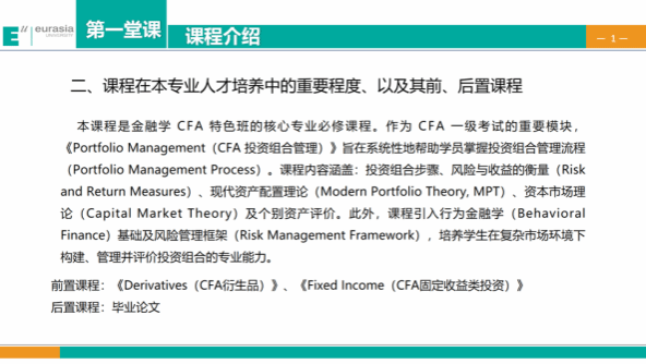 在课程体系构建上,本次说课(试讲)的一大亮点是深度衔接金融专业职业资格证考核。学院开设CFA系列课程,将CFA一级考试核心知识点融入日常教学,涵盖公司金融、投资组合管理、固定收益类投资、权益投资和另类投资等方向,让学生在课程学习中同步完成职业资格证备考,实现“课程学习+考证准备”一体化,缩短学生职业发展周期,提升就业核心竞争力。
