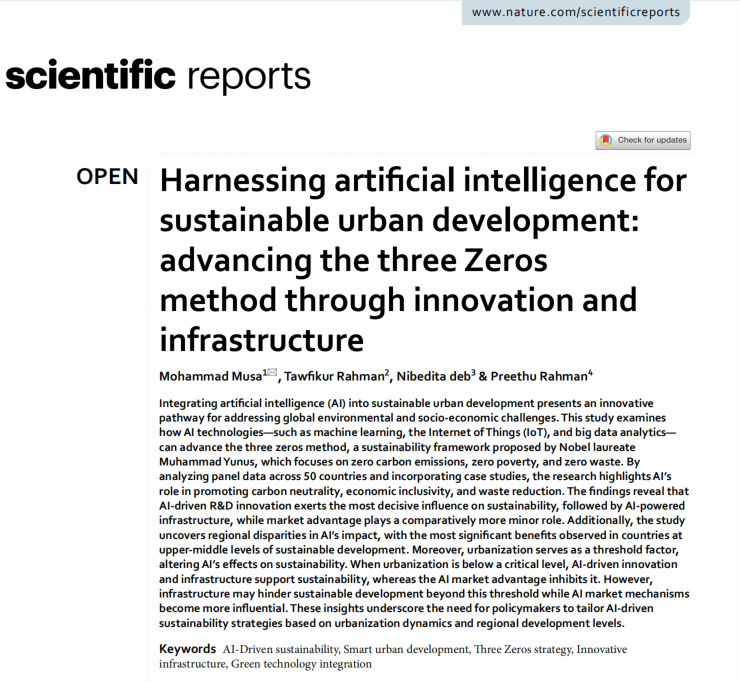 另一篇发表于《Scientific Reports》的论文《Harnessing Artificial Intelligence for Sustainable Urban Development: Advancing the Three Zeros Method through Innovation and Infrastructure》,则将视角投向了人工智能(AI)与城市治理的交叉领域。该研究基于诺贝尔奖得主穆罕默德·尤努斯提出的“三零”愿景(零碳排放、零贫困、零浪费),系统探讨了机器学习、物联网及大数据分析如何赋能城市规划。研究发现,AI驱动的创新能够显著提高能源使用效率与环境监测能力,为构建具有包容性与韧性的智慧城市提供技术支撑。这两项成果不仅拓展了金融与经济学在可持续发展领域的应用边界,也为学院在“数字金融+绿色经济”方向的学科建设提供了新的理论视角。
