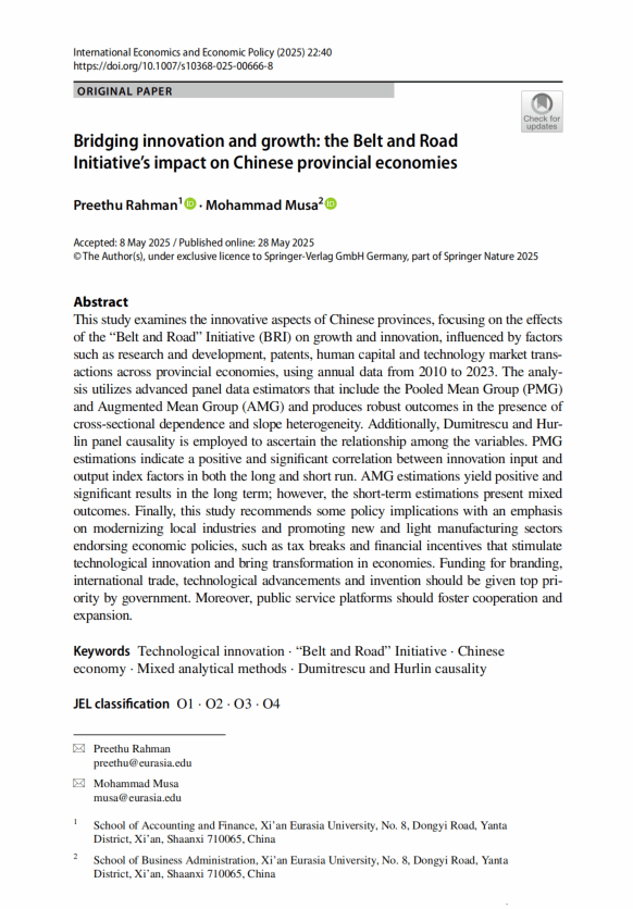 科研产出是学科建设的核心指标。莉娜博士近期的两项研究成果,分别聚焦宏观经济政策与数字技术创新,展现了其在跨学科领域的深厚造诣。在《Bridging Innovation and Growth: the Belt and Road Initiative’s Impact on Chinese Provincial Economies》一文中,莉娜博士深入剖析了“一带一路”倡议如何通过研发(R&D)投入、专利活动及人力资本积累,驱动区域创新能力的提升与经济绩效的增长。研究证实,“一带一路”相关的基础设施投资与互联互通举措,有效促进了技术转移与投资流动,显著增强了沿线省份的创新驱动力。这一发现为理解国家战略的经济效应提供了坚实的实证依据。
